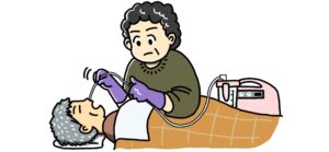 在宅では家族も吸引をしなければならない場合があります。家族が安心して吸引を行えるよう物品の準備や手技の説明など行いましょう。吸引の機器も種類がさまざまです。患者さんの状態と用途を考えて適したものを選択しましょう。痰を取り除く方法は吸引だけではありません。無理な吸引は粘膜を傷つけたり出血の危険性もあります。吸引以外で痰を取り除く方法を工夫するのも1つです。