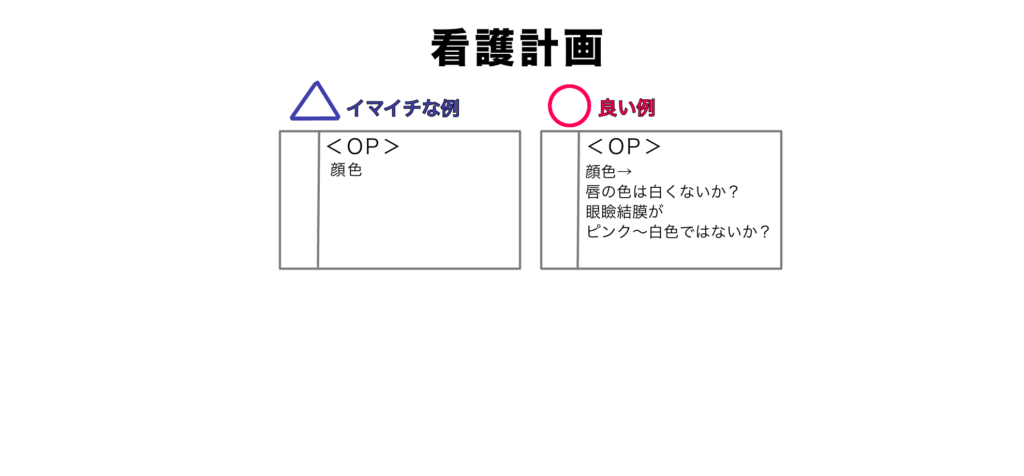 例えば「(O-P)顔色」とあっても、患者さんによって見るべきポイントや観察の仕方は異なります。