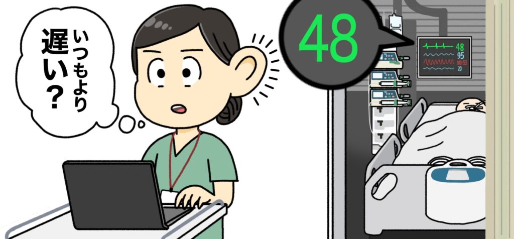 ICUで夜勤中、心電図モニターのアラームは鳴っていないものの、心拍のビープ音がいつもより「間延びしている」とある看護師が気づきました。数値を見ると、心拍数が徐々に低下。すぐに患者のもとへ向かい、意識レベルと血圧を確認。医師へ迅速に報告し、薬剤調整が行われました。