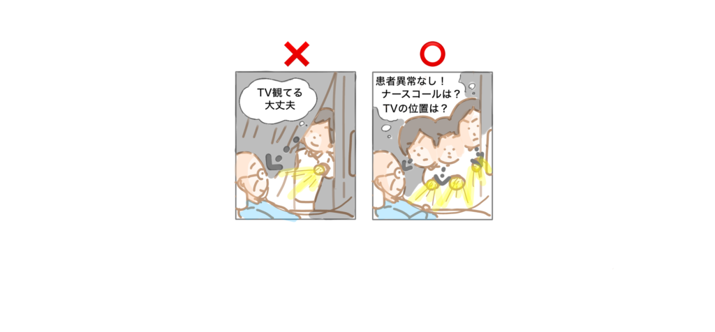 先輩の助言を受け、私はAさんのいる4床室の入口付近にカートを配置。Aさんの部屋を拠点に業務を開始し、5分おきに訪室し、その都度様子を確認していました。