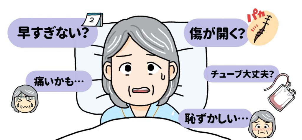 初回離床の際、患者さんがよく口にする不安には、次のようなものがあります。