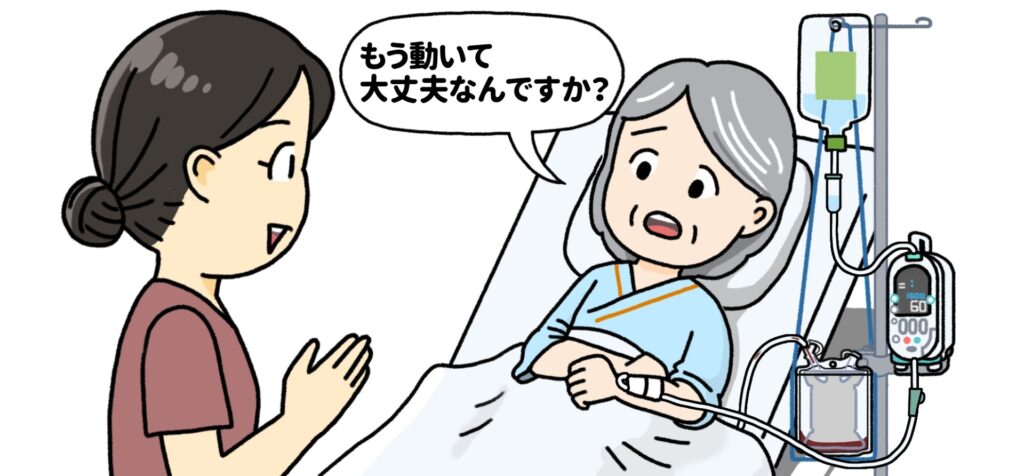 とくに術翌日は、点滴や酸素マスク、ドレーンなどのルート類が多く「引っかかって抜けてしまうのでは?」と感じる患者さんもいます。