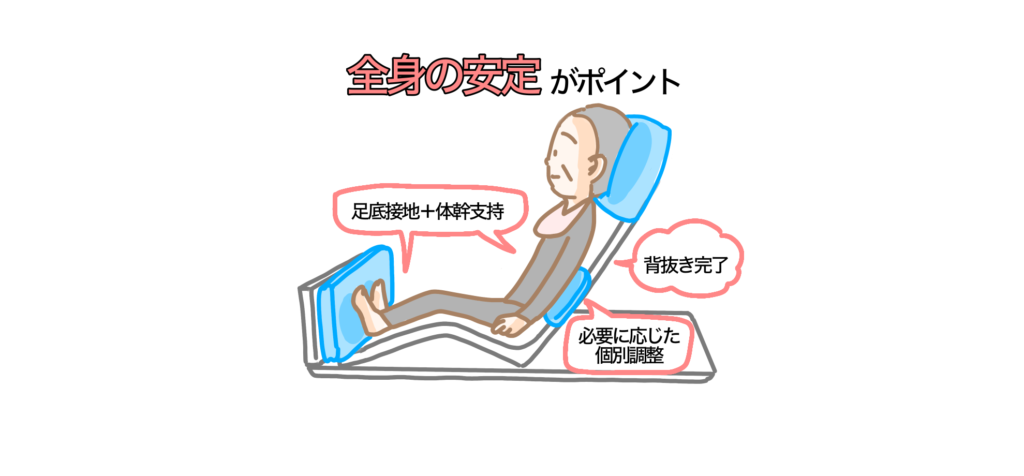 ・体幹が安定するよう、円背などで体幹保持が難しい場合には、背部や腰部にクッションを入れて上半身を支持し、ずり落ちを予防する