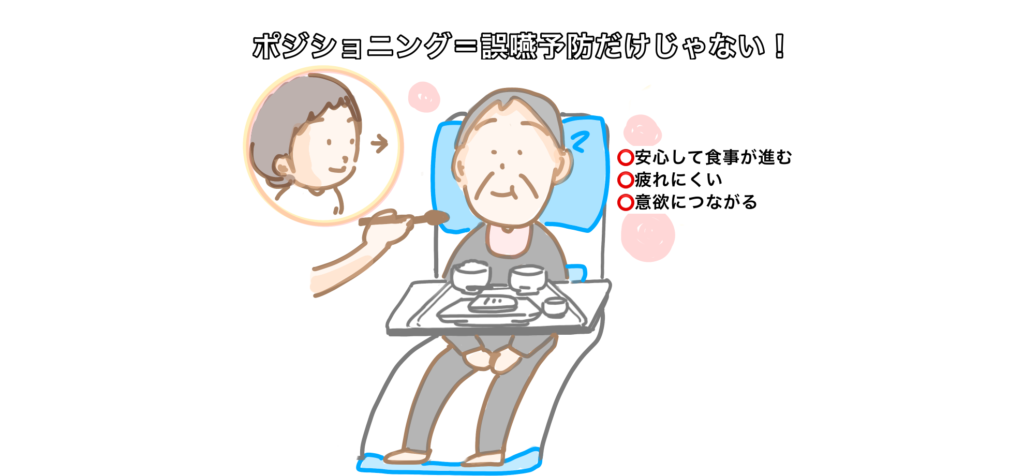 食事介助におけるポジショニングは「誤嚥予防」のためだけではなく、安心・安楽に食べ続けられるためだということです。