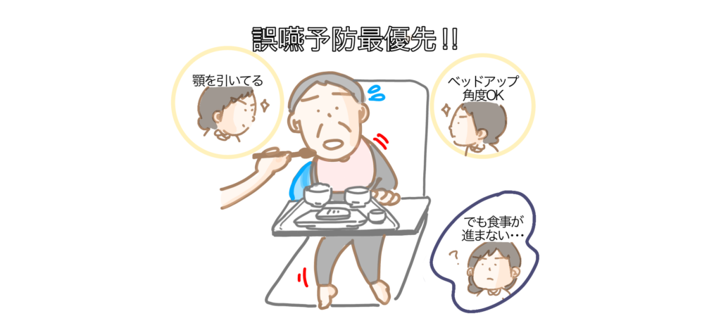 嚥下機能の低下もあり、食事中にむせることがありました。私は「誤嚥を防ぐこと」を最優先に目標や計画を立案し、ギャッジアップの角度や頚部の傾きに注意し食事介助を行っていました。しかし、患者さんは途中で食事が進まないことが多かったです。認知症があり発語も少ない方で理由を聞いても返事は返ってきませんでした。私は食事内容の問題や空腹感がないことが理由ではないかと考えていました。