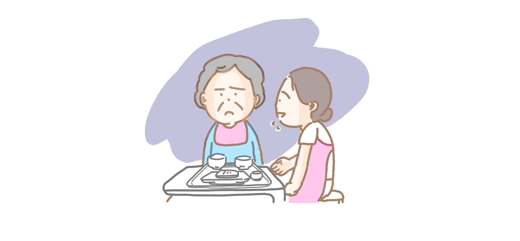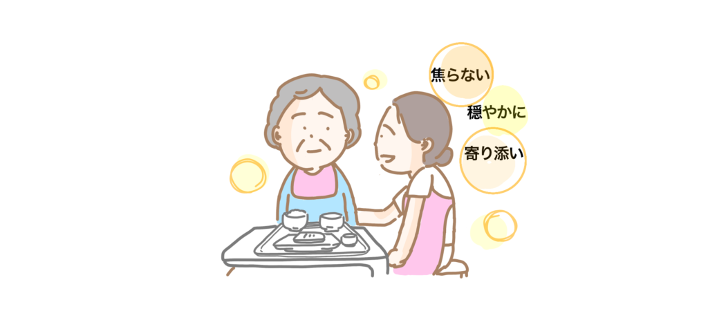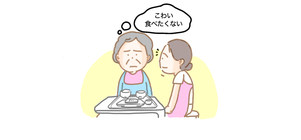 たとえ丁寧な声掛けでも、患者さんは焦らされていると感じていたのかもしれません。そのときの私は患者さんが最後まで食べきることを食事介助の目標としていました。患者さんのペースに合わせず食事を「はい、次これ」と急がせるような声のトーンになっていたのだと思います。私は真剣なあまり表情が硬くなり笑顔を忘れてしまっていたのでしょう。私の表情や動作は患者さんに「怖い」「嫌だ」といった感情を起こさせていたのだと思います。