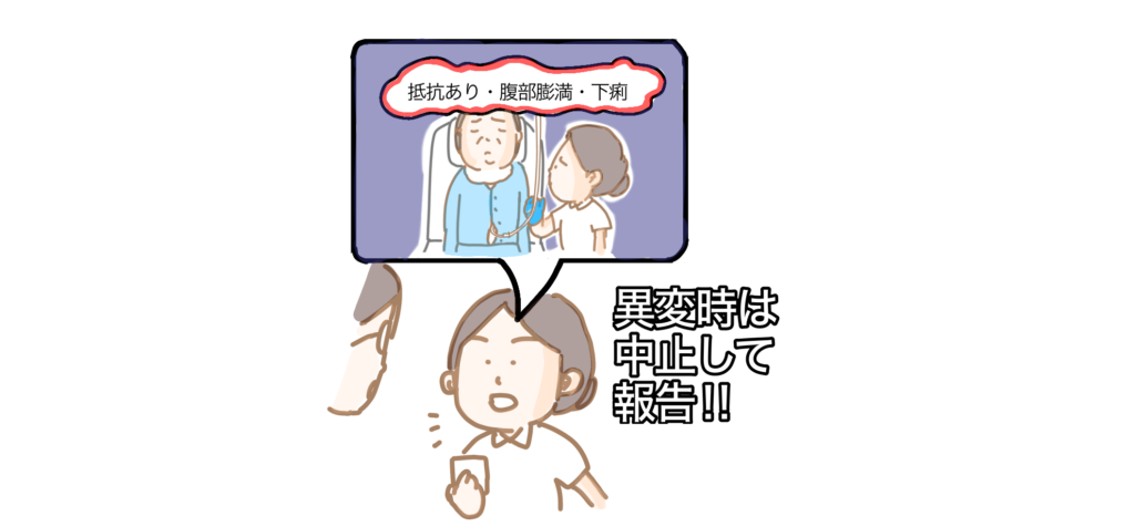 ・異変時は注入を中止し、根拠となる観察情報を添えて医師へ報告する