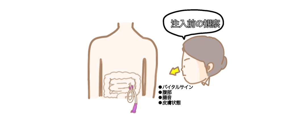 ・腸ろうは胃ろうと異なり、注入速度と腹部症状の変化を重点的に観察する