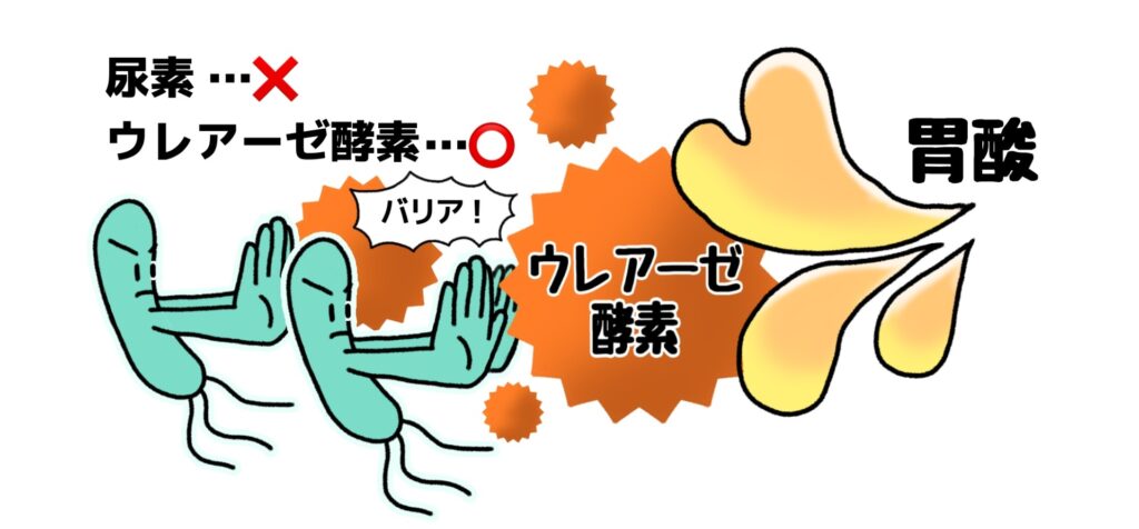 1で解説した通り、ヘリコバクター・ピロリは尿素を作るのではなく、「ウレアーゼ」という酵素を作り胃酸から身を守っています。
