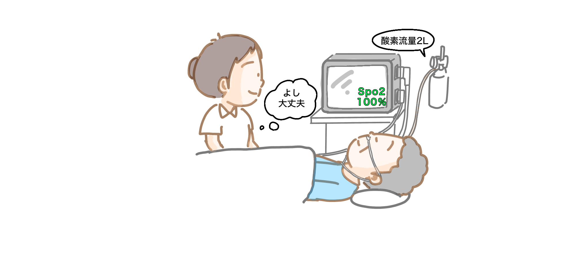酸素流量は2L/分。患者さんの呼吸回数や呼吸の様子も落ち着いていたので何の違和感も感じずに、家族や体調のお話をして過ごしていました。