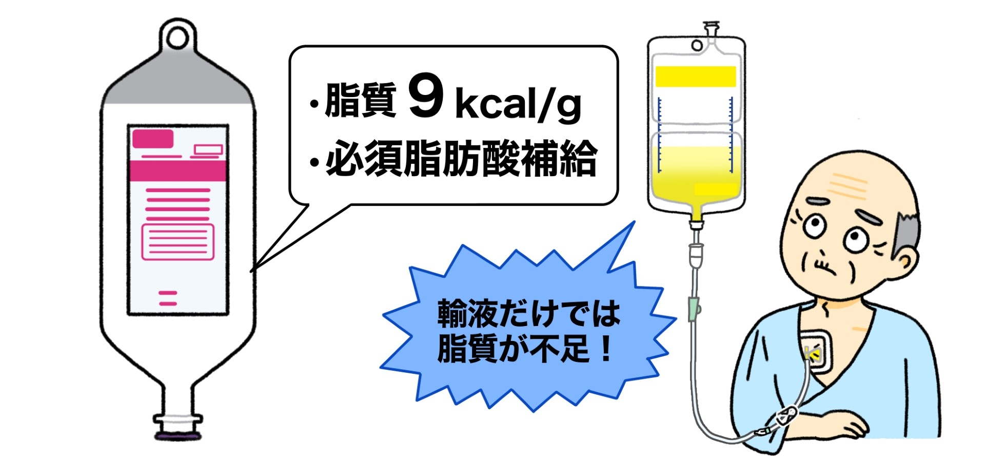 脂質は、三大栄養素の糖質・タンパク質・脂質の中で最もエネルギー値が高い栄養素です。糖質・タンパク質が4kcal/gに対し、脂質は9kcal/gと効率の良いエネルギー投与が可能です。また、輸液には脂質が含まれないため、長期的な輸液のみの栄養管理では必須脂肪酸欠乏症になる恐れがあります。イントラリポス投与には、この必須脂肪酸欠乏症を予防する役割もあります。