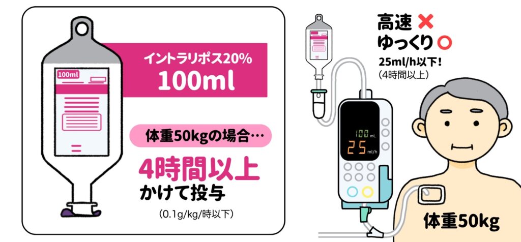 急速投与してしまうと、うまく代謝されず高トリグリセリド血症をきたすことも。イントラリポスは、0.1g/kg/H以下での投与が推奨されています。