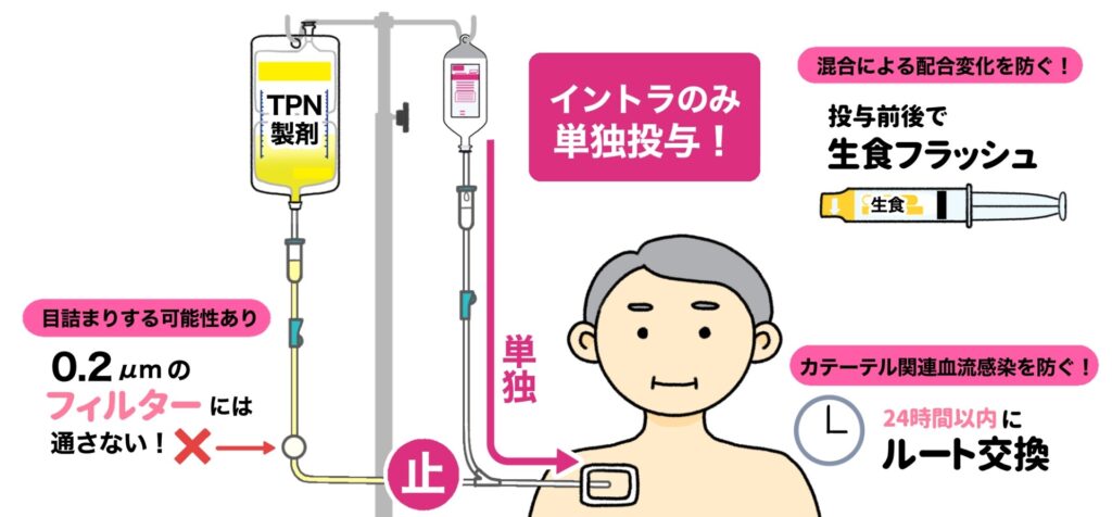 また、ルート内でその他の薬液と混合すると、配合変化をきたし、肺塞栓などを引き起こす可能性があります。このため単独投与が必要です。他の薬剤が投与中であれば、その薬剤を止め、生理食塩液でフラッシュをしてからイントラリポスのみを投与しましょう。