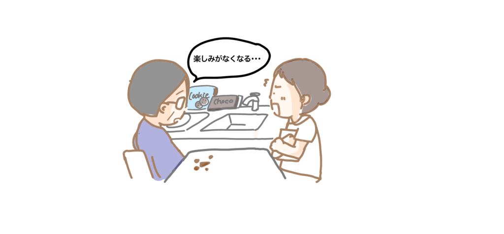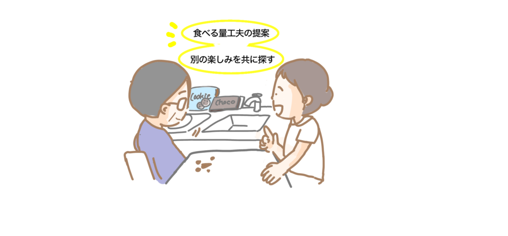 たとえば「無理に我慢するより、食べる量や時間を工夫してみるのはどうでしょう?」や甘いものを食べたいときに、少し別の食べ物にかえてみるのはどうでしょう?」などの声掛けができればよかったのではないかと思います。
