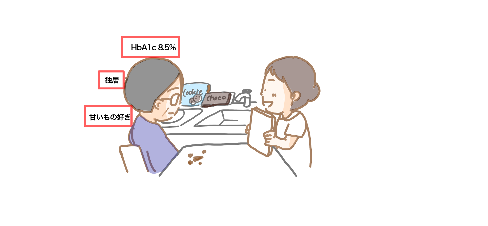 私は真っ先に指導計画として「甘いものの制限」を挙げました。そして「糖尿病が進行しないためにも食事制限をしなければなりません。まず甘いものをやめましょう。」と指導。患者さんはその場では笑いながら「はい、はい」と言ったものの、翌日訪問するとテーブルの上にチョコレートの食べかすがたくさん……。私は前日に伝えたことを再度伝えました。しかし患者さんは「もう歳なのにあれダメこれダメと言われたら生きてる楽しみも意味も感じられない」と急に顔色を変えて話されました。患者さんのその反応をみて、患者さんの気持ちを考えず一方的に、こちらの看護を押し付けているだけだったと反省しました。