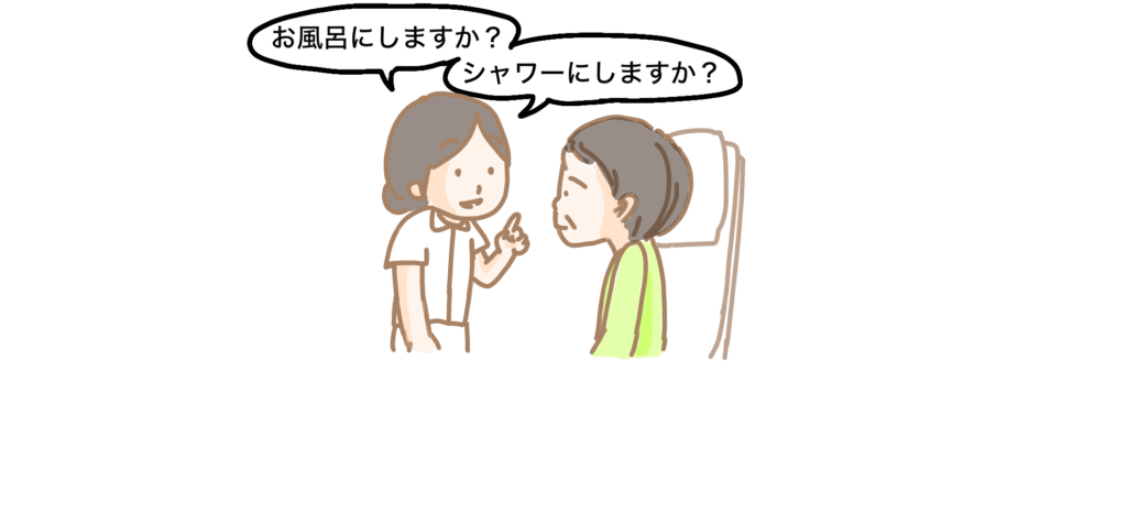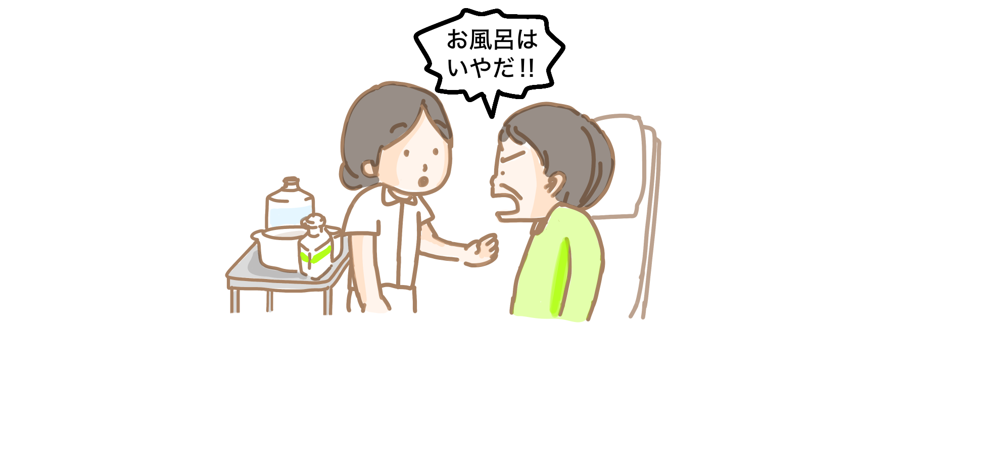 「入浴」という言葉は、湯船につかることを一般的に連想します。患者さんが「お風呂は嫌だ」と拒否した時に、入浴全般を拒否していると決めつけるのではなく、シャワー浴や部分浴などいくつか選択肢を提示してできそうなことを探ることが大切です。患者さんが何を望んでいるのかを汲み取り、患者さんが自分で選べるように配慮すると、安心感や協力の得やすさにつながるかもしれません。