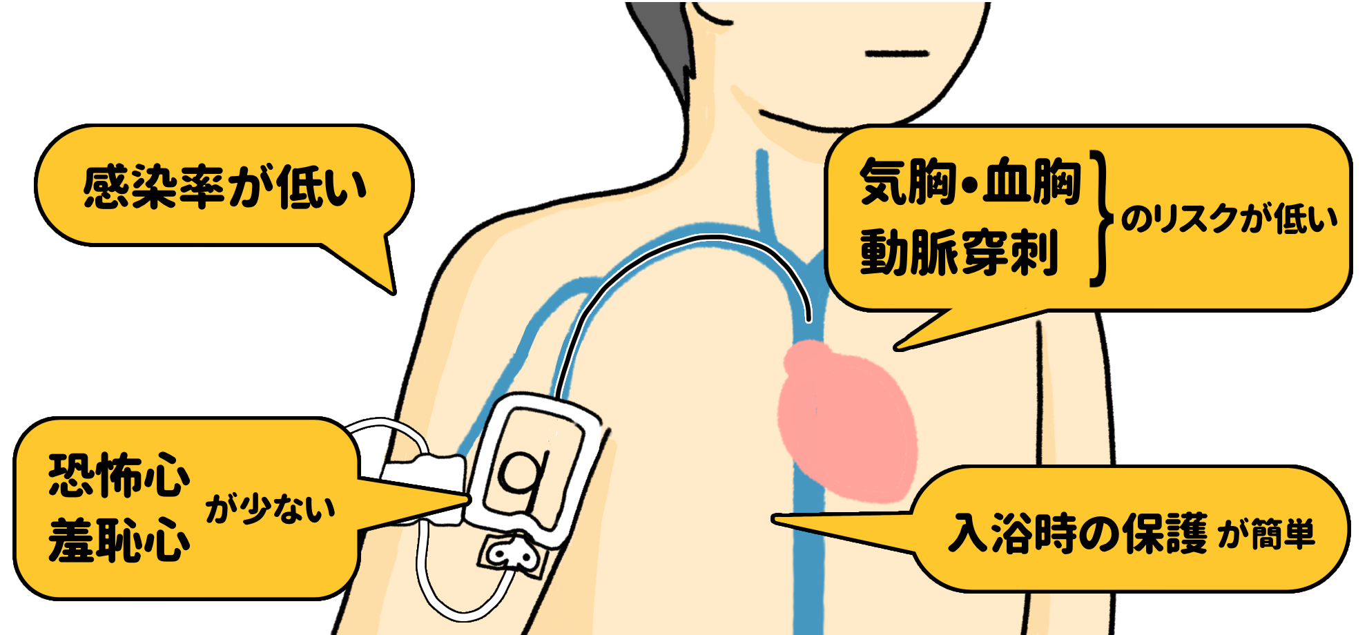 上腕から挿入するため、解剖学的にCVカテーテル挿入時の気胸・血胸、動脈穿刺といった合併症を伴うリスクが低いです。