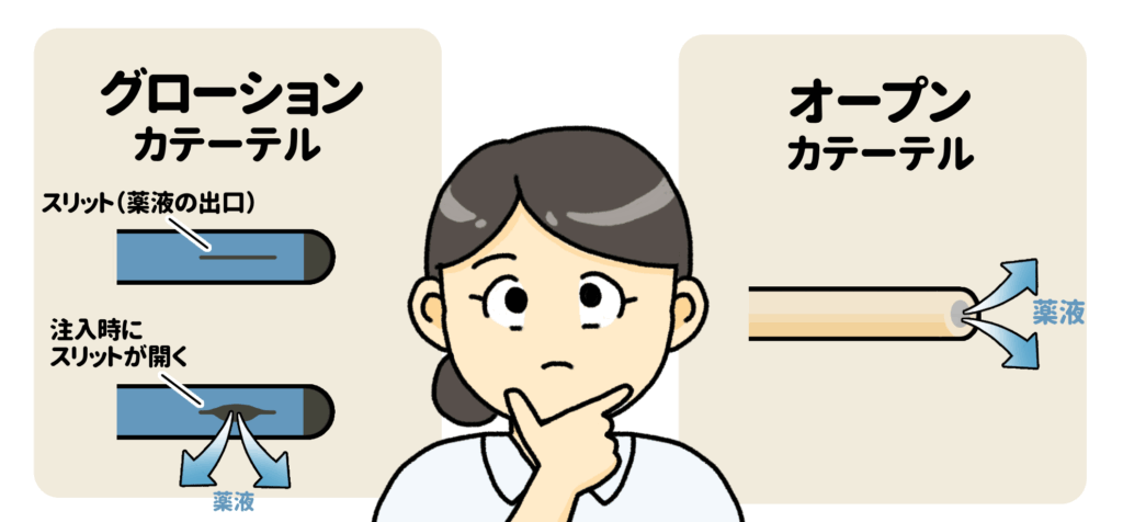 CVカテーテルやCVポート同様、PICCの先端構造にはグローションタイプとオープンタイプとがあります。先端によって特徴が違うので確認をしておきましょう。