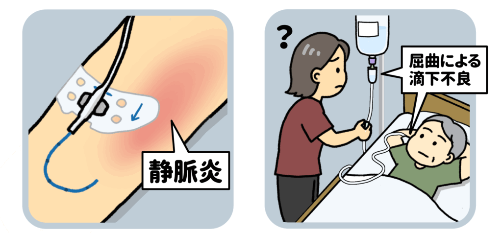 頸部や鼠径部に挿入されているCVカテーテルと比べ、上腕の血管は細く、PICCも細いため血管とカテーテルの摩擦が生じやすく静脈炎のリスクが高くなります。また、挿入時の手技や血管選択によって、静脈炎のリスクが上がることが報告されています。