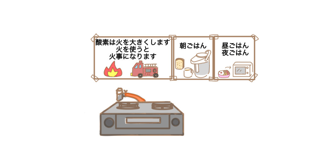 ・「酸素は火を大きくします。火を使うと火事になります」と理由を示し、消防車のイラストを添えた。