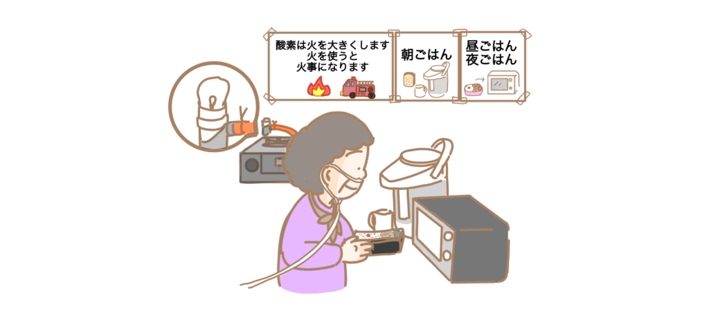 訪問中には「酸素を吸っているので、火は危ないです。使わないでくださいね。」と伝え、配食弁当が届くこと、朝食のパンを焼くトースターは使用できることを説明しました。