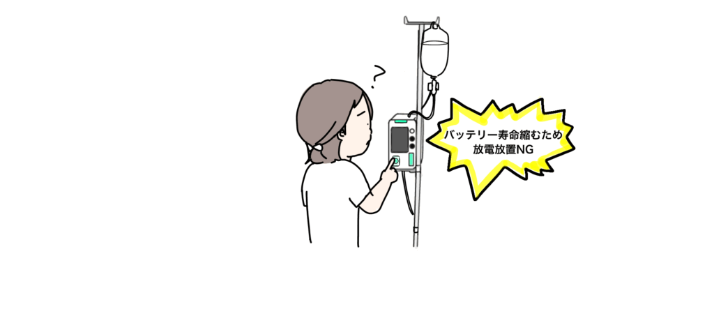 普段使用していない医療機器であっても、そのまま放置すると放電してしまいます。いざという時に使用できず、バッテリーの寿命も縮めてしまう可能性があります。