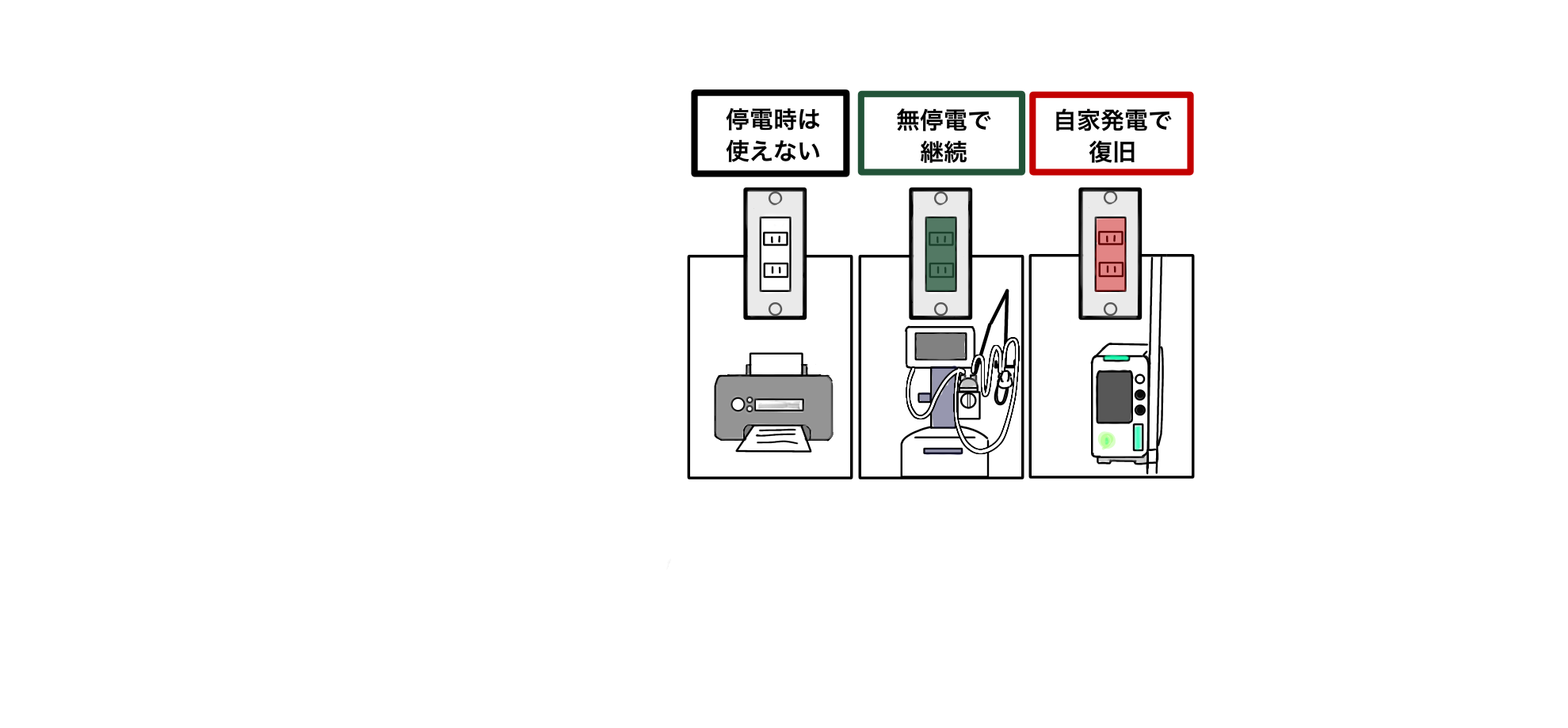 白色のコンセント:停電時は電力の供給が止まります。家庭で使われているコンセントと同じで、通常の電気供給です。例えばプリンターなど事務用の機器、使用していない医療機器の充電などに使用します。