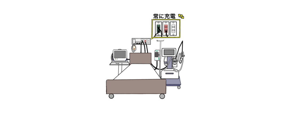 一時的に電源が途絶えても影響のない医療機器が対象です。例えば、バッテリーが内蔵されている生体モニターや輸液ポンプ、バッテリー内蔵の一部の人工呼吸器などです。